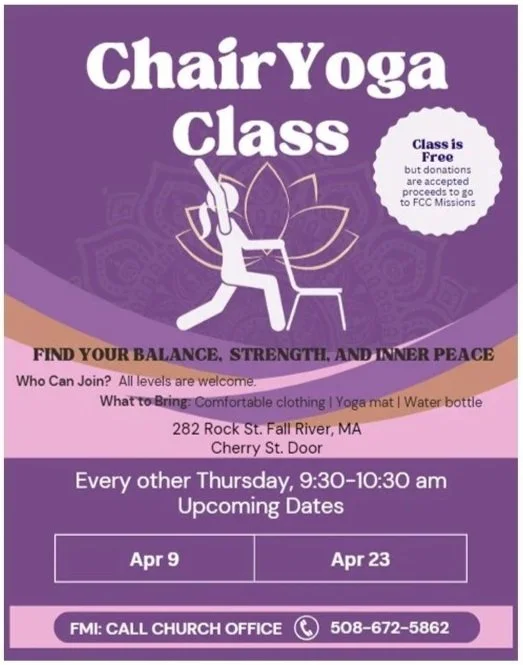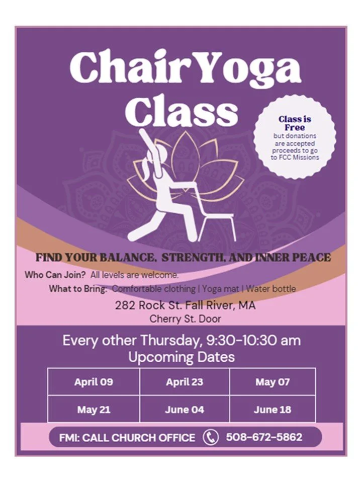 The First Congregational Church of Fall River, 282 Rock Street, Fall River Ma is pleased to announce FREE YOGA Classes, open to the public (ages 13 and up) and for all levels are welcome.
